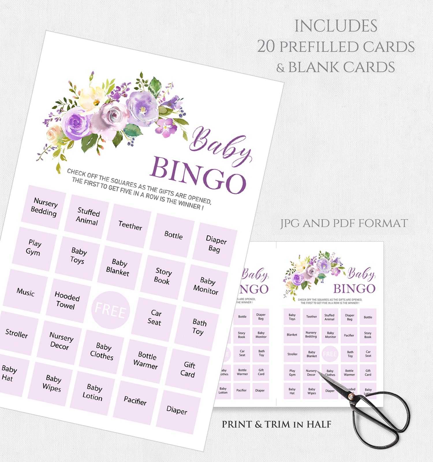 Baby Shower GAME BINGO Prefilled Cards Set , Lavender Design, Baby002